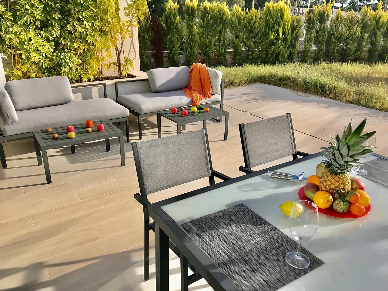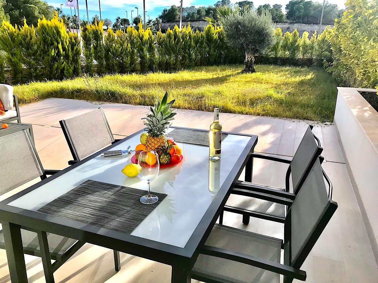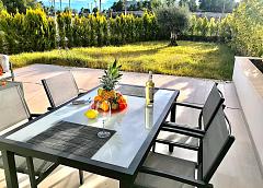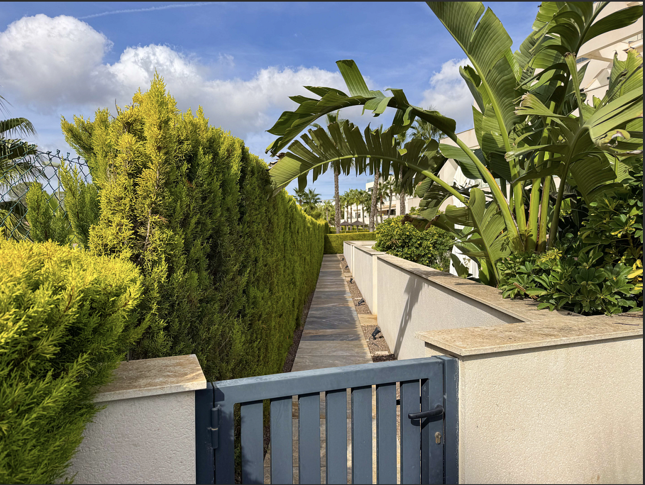 Планировка продумана до мелочей: три просторные спальни и две ванные комнаты, включая приватную ванную в главной спальне. Просторная и наполненная светом гостиная плавно переходит на большую террасу и в собственный зелёный сад с кипарисами, пальмами и оливковым деревом — идеальное место для отдыха и приёма гостей.