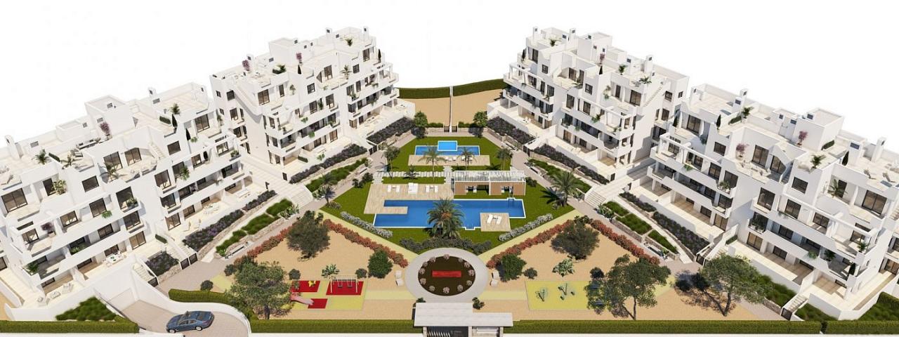NEW BUILD RESIDENTIAL IN PRIVATE GATED RESORT IN PROVINCE OF MURCIA New Build residential complex has 60 apartments distributed in 4 blocks with terraced area for ground, first and second floors, community swimming pool, heated swimming pool and solarium with Summer kitchen on the penthouses, to enjoy all hours of sunshine every day of the year. The properties have 2 bedrooms and 2 bathrooms as well as parking space and storage room in the basement. These homes are designed with a contemporary style and open planned concept, comprising a fully-fitted kitchen and lounge-dining room. The properties will meet the highest standards and included: Kitchen completely furnished and equipped with oven and microwave in column, integrated fridge and dishwasher, induction hob and extractor fan. LED Lighting: inside the property (dining room, kitchen, corridors and bathrooms), and as well as in outdoor areas. Lined wardrobes with drawers. Motorised blinds in bedrooms. Heated floors in bathrooms. Fully fitted bathrooms with toilet, vanity unit, mirror, shower with rain effect and screen panels. Pre-installation for ducted air conditioning. Pre-installation of charging point for electric vehicles. Solarium with Summer kitchen, with pre-installation for electric appliances. Community swimming pool. Heated swimming pool. Parking space and storage room in the basement. Located in a private gated resort, with a main access entrance and 24 hours security. The resort is designed around an impressive 126.000 m2 green area. It comprises walking and cycling paths, sport facilities, paddle and tennis courts, a mini-golf course, gardens, dog parks, leisure areas, clubhouse…. Also in the central area is the jewel of the resort, a crystal-clear artificial lake of almost 17.000m2 of water surface, surrounded by white sandy beaches and palm trees, bringing a piece of the Caribbean to the Murcia Region. There are 2 islands in the lake, one of them has its own bar, there are also “beach Chiringuitos” spread around the lake. The resort is strategically located less than 4 km from the beach and the town of Los Alcázares, where you can practice various water sports, surrounded by several golf courses and the city of Cartagena less than 15 minutes by car and 22 km from Murcia airport, therefore having a wide cultural, gastronomic and sports offer within reach.