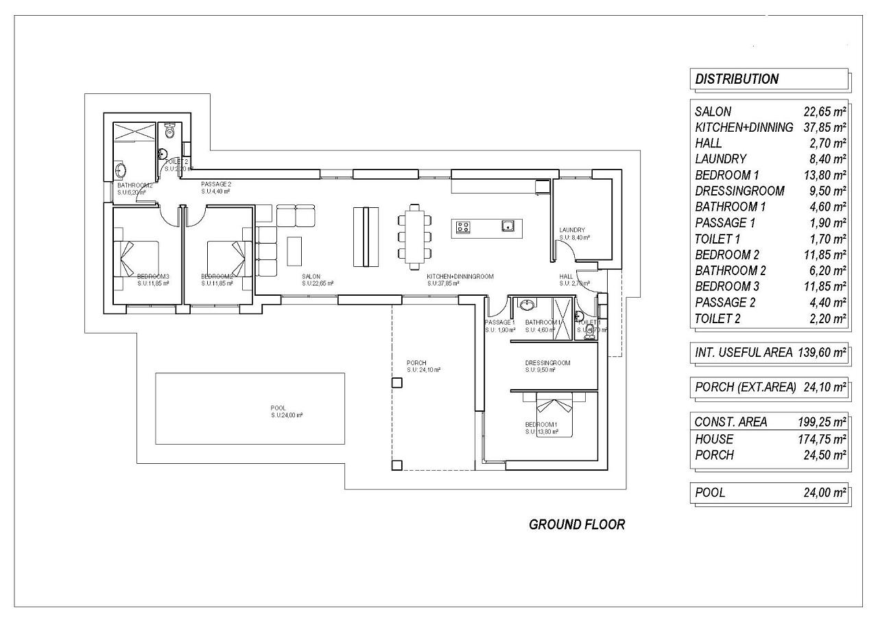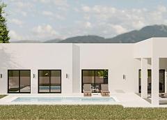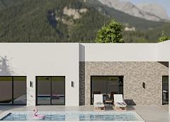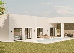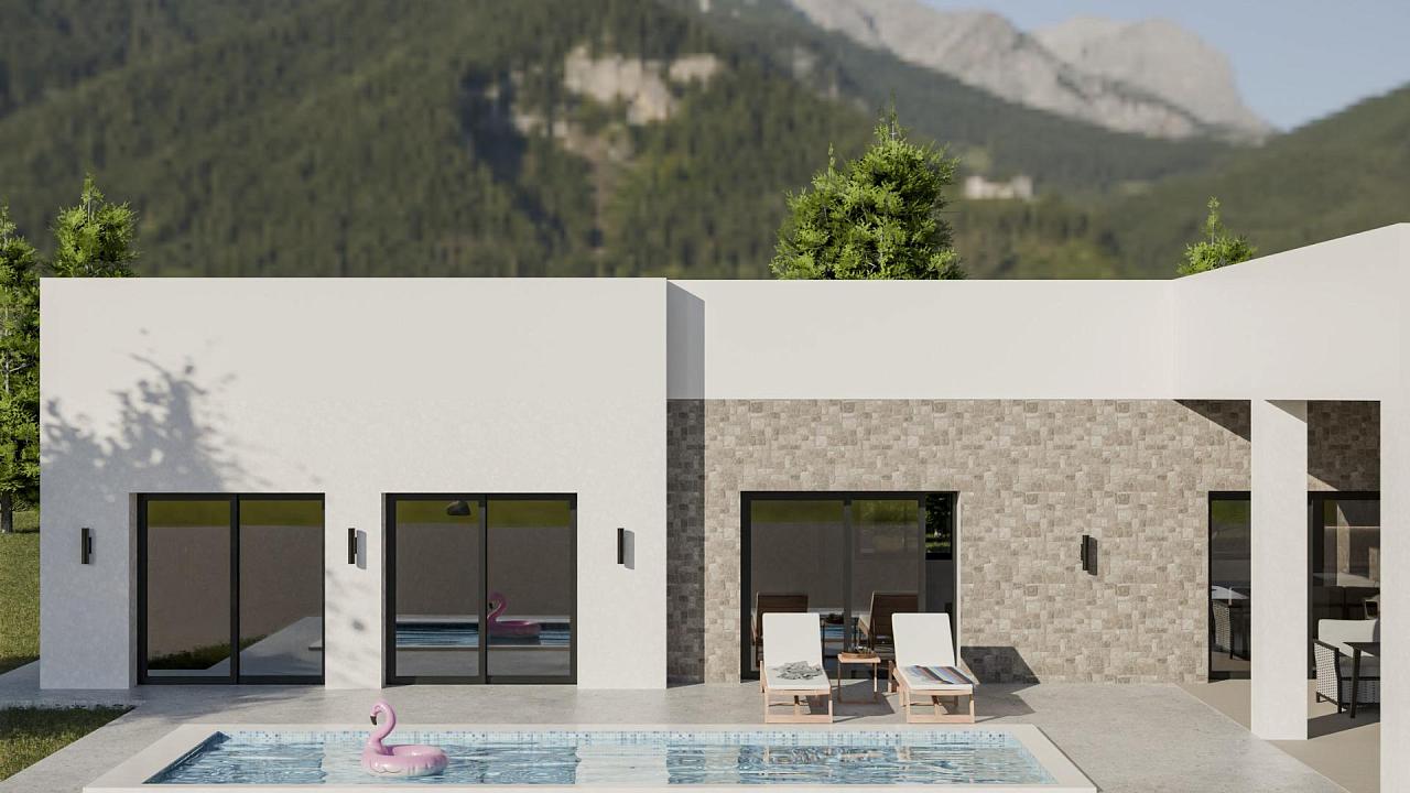 NEW BUILD VILLAS IN PINOSO New Build Independent modern villas that can be built on rustic or urban plots of land we have a wide range available in the area of Pinoso: • 3 bedrooms, 2 bathrooms, 2 guest toilets • Private swimming pool • Full installation of air conditioning • Full equipped kitchen • Big choice of quality materials • Mains electricity and water • 4 solar panels included • AA Energy Label • Plots from 10.000 m2 in various locations to choose from. • 3.000 m² fenced plot for easy maintenance • Motorised sliding gate On the rustic plots, about 3.000 m2 of the total plot will be fenced and the houses will be delivered with about 1.000 m2 of gravel around the house. The house has a private swimming pool and photovoltaic solar panels for the electricity supply. There are several rustic plots to choose from in different locations, each with a different price (in the prices published in this advert a plot with a value of 40.000 eur has been considered, if the buyer chooses another plot, the final price will be recalculated accordingly). The delivery period is 8 months from the granting of the building licence. It is acquired under a self-promotion regime: the buyer makes payments on account of the price as the builder executes the work.