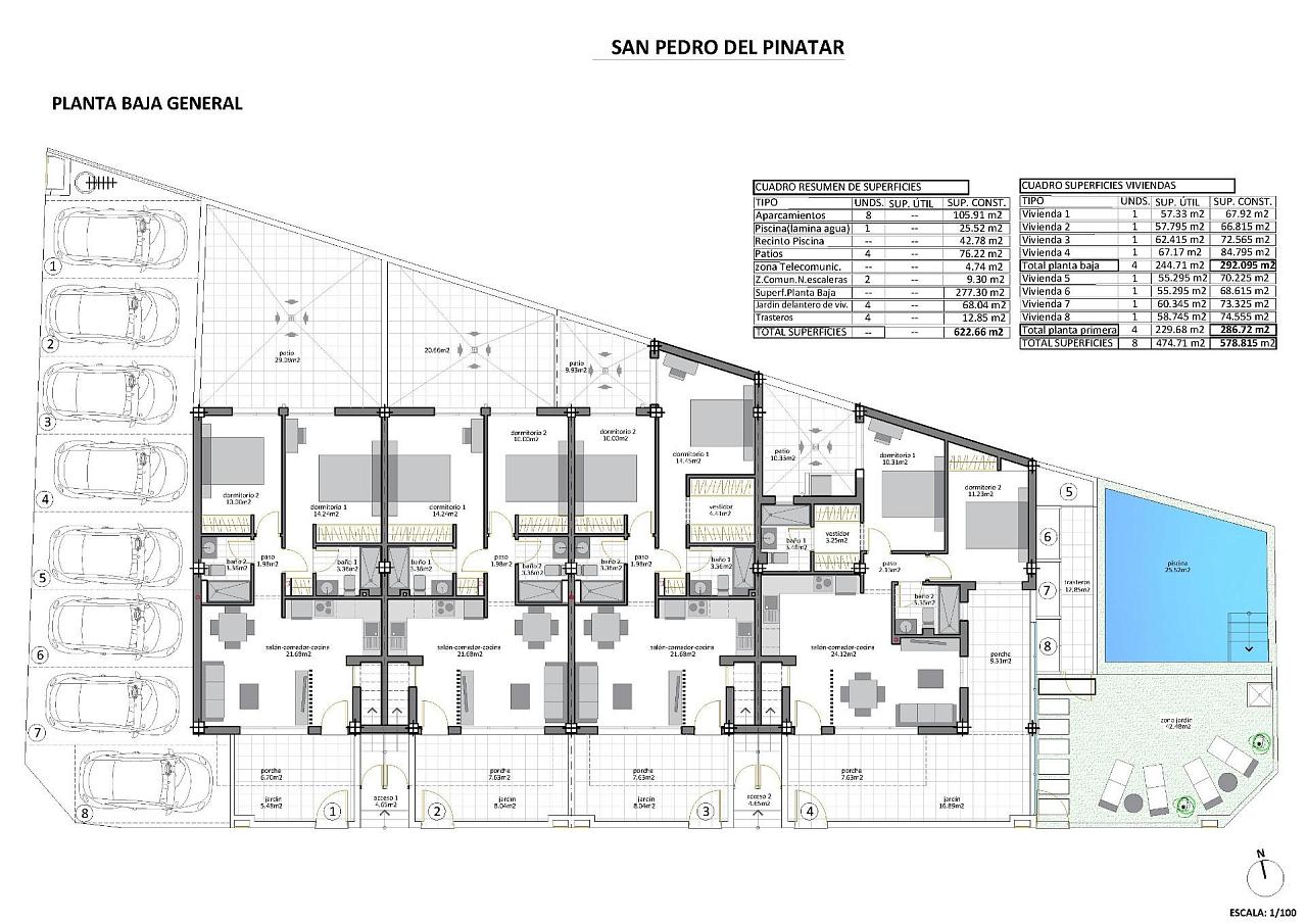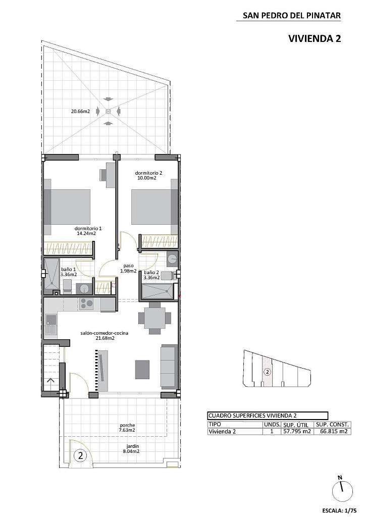 New Build Bungalows in San Pedro del Pinatar – Prime Location Just 500m from the Beach Exclusive Boutique-Style Homes Near the Coast Discover these elegant new construction bungalows in the heart of San Pedro del Pinatar, just 500 meters from the stunning beaches of the Mar Menor. This boutique development includes only eight signature homes, combining modern design, comfort, and a tranquil coastal lifestyle. Available Models to Suit Your Lifestyle Garden/Ground Floor Model: Features a front terrace and a spacious rear patio, perfect for outdoor living. Penthouse Loft Model: Includes a private rooftop solarium and a front terrace, offering open views and an abundance of sunlight. Garden/Ground Floor Model Details Step into a bright living space that seamlessly connects to the dining area and a fully fitted kitchen. Large sliding glass doors let in natural light, creating an open and inviting ambiance. The layout includes two spacious bedrooms, with the master bedroom boasting an en-suite bathroom, as well as a modern family bathroom. Penthouse Model Highlights Access the penthouse via a private staircase leading to a large terrace. Inside, an open-plan lounge and dining area blend with a fully fitted kitchen. Two bedrooms are included, with the master bedroom offering an en-suite. A private rooftop solarium, accessible from the kitchen, provides an ideal spot for relaxation or entertaining. Additional ground-floor storage ensures convenience. Key Features and Amenities Internal and external LED lighting. Fully fitted kitchen with induction hob, oven, dishwasher, and fridge/freezer. Air conditioning installed. Designated parking space. Landscaped communal garden with a swimming pool for residents. San Pedro del Pinatar: Coastal Charm and Convenience Located on the beautiful Mar Menor and Mediterranean coastlines, San Pedro del Pinatar is a haven for watersports, sailing enthusiasts, and beach lovers. The nearby Lo Pagán area offers natural mud baths, calm waters, and year-round amenities, including shops, restaurants, and leisure facilities. Distances to Key Points of Interest: Dos Mares Shopping Center: 5 km Murcia/Corvera Airport: 30 km Alicante Airport: 75 km Local golf courses: 10–20 km Marina and sailing clubs: 2 km Reserve Your Dream Home Today With completion scheduled for late 2025, now is the perfect time to secure your new home in San Pedro del Pinatar. Don’t miss this opportunity to enjoy a blend of modern elegance and coastal tranquility. Contact us today to learn more or arrange a visit! 271