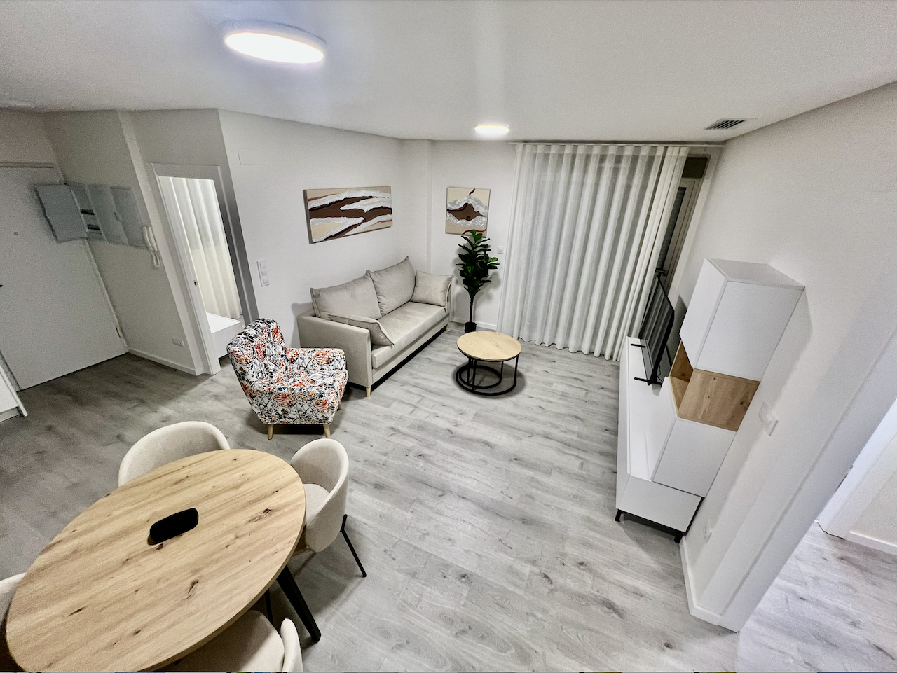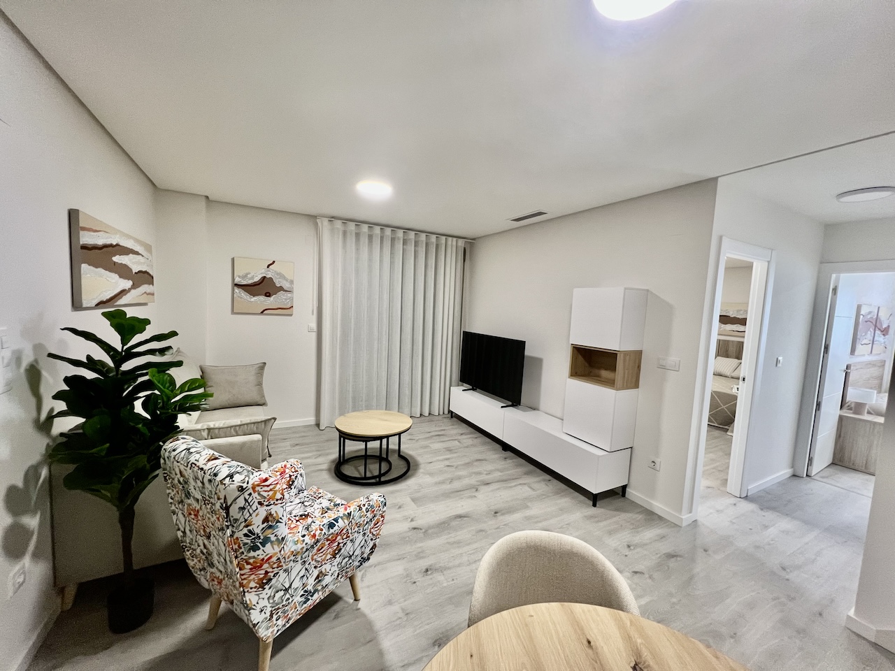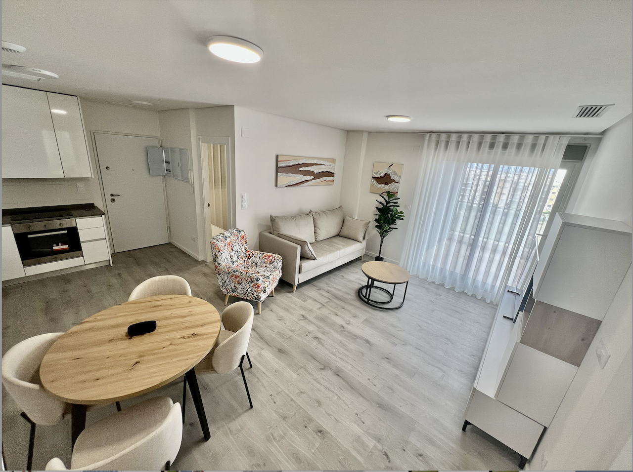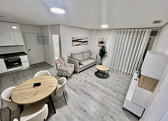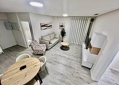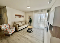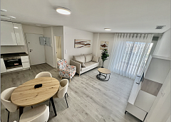 The apartment has 3 bedrooms and 2 bathrooms, a spacious bright living room with an American-style kitchen, equipped with kitchen furniture, stove, oven, extractor hood and microwave.