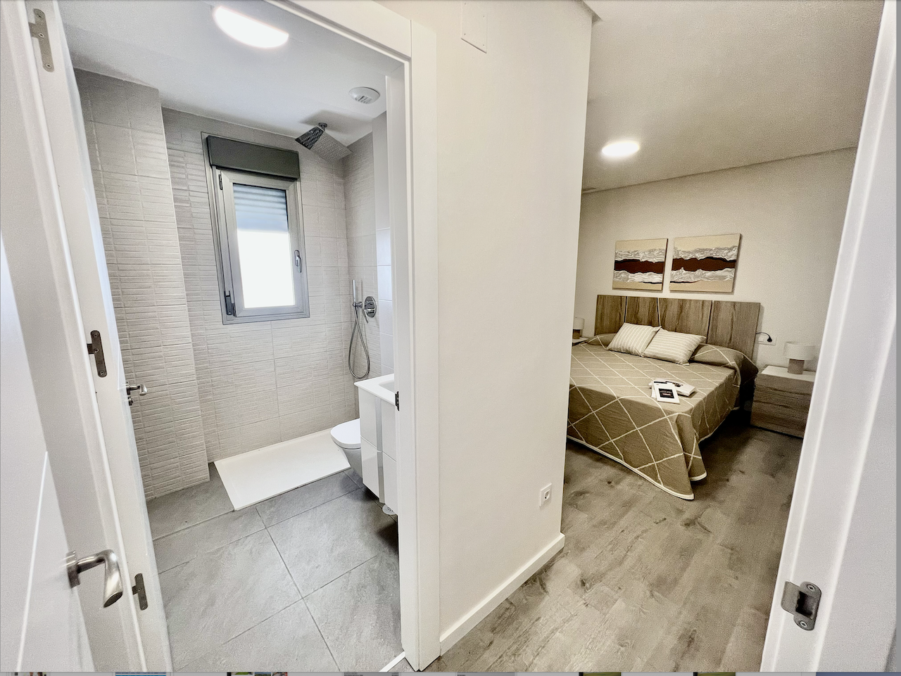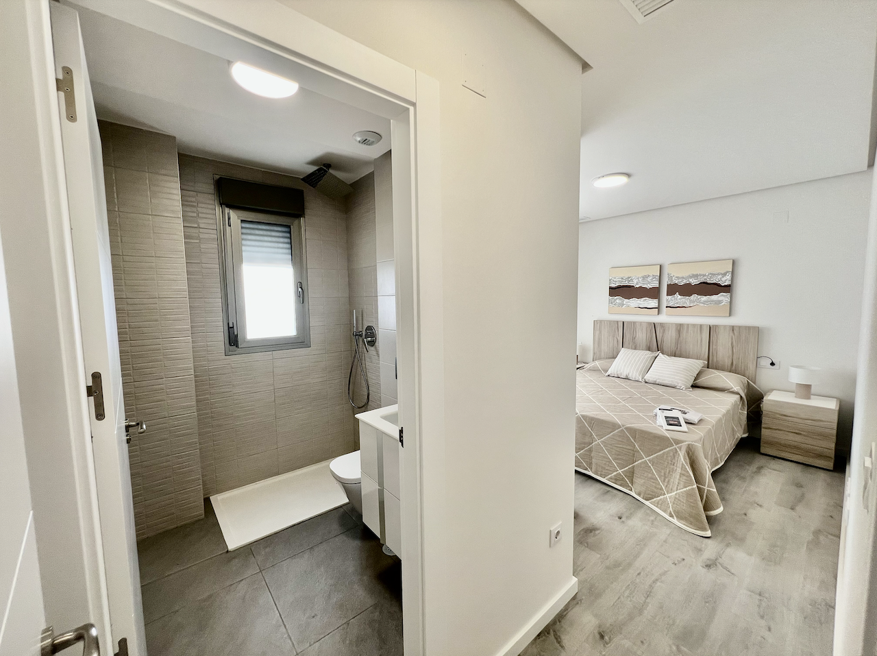 Bathrooms are equipped with sanitary ware, bedside tables and underfloor heating.