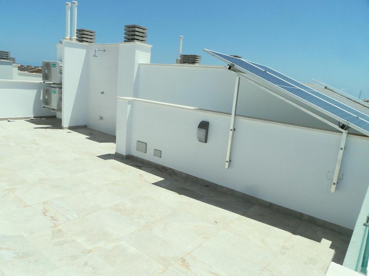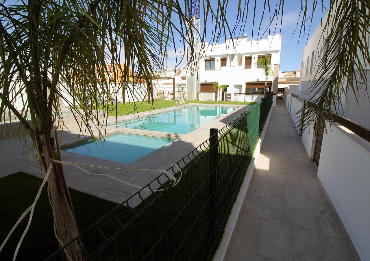 NEW BUILD TOWNHOUSES IN PILAR DE LA HORADADA New Build modern townhouses built in a quiet part of Pilar de la Horadada with proximity to everything you need. Townhouses has 4 bedrooms, 2 bathrooms, open plan kitchen, living room with direct access to the cozy pool area, terrace at the back with parking space , terrace and large roof solarium. Pilar de la Horadada is a typical Spanish village in the most southern part of the Costa Blanca. The large main street has supermarkets, lots of shops, restaurants and bars and some lovely squares. The beautiful beaches of Torre de la Horadada and Mil Palmeras with fine sand promenade is just 5 minutes away. The airports of Corvera (Murcia) and Alicante are respectively 40 and 55 minutes away. 271
