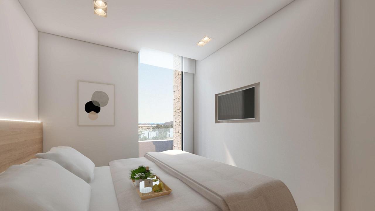 RESIDENCIAL DE OBRA NUEVA EN LA MANGA CLUB RESORT Exclusivo residencial de obra nueva de 42 apartamentos ideal para uso personal o inversión en uno de los famosos Resorts de La Manga Club. Estas modernas y luminosas residencias ofrecen impresionantes vistas al Mar Menor, y sus amplias terrazas y la piscina comunitaria permiten disfrutar al máximo del sol mediterráneo. Se trata de la última promoción céntrica de viviendas de obra nueva en La Manga Club, a sólo 5 minutos a pie de todas las tiendas y restaurantes. Los derechos deportivos están incluidos y cada vivienda incluye un trastero. Puertas interiores de una hoja de 210x82,5x4 cm., de tablero DM, prelacadas en blanco, con ranuras horizontales cada 50 cm. Armario empotrado prefabricado con puertas correderas, de panelado de tablero DM, prelacado en blanco. En baños, alicatado con gres porcelánico, tamaño 60 x 30 cm, colocado sobre superficie soporte de pared interior de cartón yeso laminado. En cocinas, alicatado con azulejos de gres porcelánico, formato 60 x 30 cm, colocados sobre soporte de pared interior de cartón yeso laminado. Sistema de calefacción por aerotermia, aire acondicionado y agua caliente sanitaria. Fancoils de alta eficiencia. Ventilación controlada mecánicamente DOUBLE FLOW. Bloque de puerta de entrada blindado. Acabado blanco. Clase de seguridad 3. Puerta metálica abatible para acceso de vehículos. Portón metálico unilateral de apertura manual para acceso peatonal. La Manga Club es uno de los principales complejos deportivos y de ocio de Europa. Rodeado de parques naturales y playas vírgenes, su privilegiada ubicación ofrece exclusivos alojamientos vacacionales y residenciales en la costa mediterránea española. Fundada en 1972, La Manga Club es una comunidad cálida, segura y vibrante que desde hace tiempo atrae a familias y amantes del golf con su variada y destacada oferta de ocio. La Manga Club goza de excelentes conexiones aéreas. Los aeropuertos locales de Corvera (a sólo 50 km) y Alicante (a menos de 100 km) ofrecen vuelos regulares al resto de Europa, lo que facilita la llegada y salida del complejo. 271