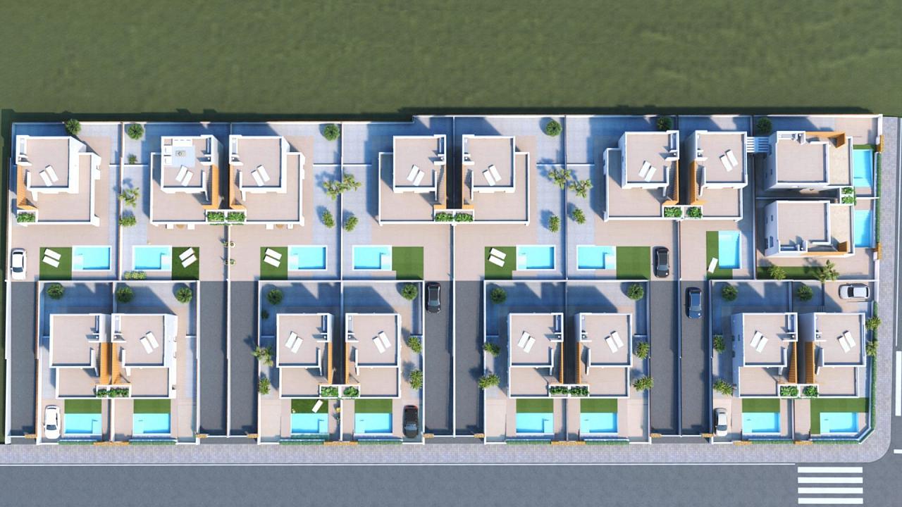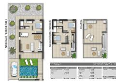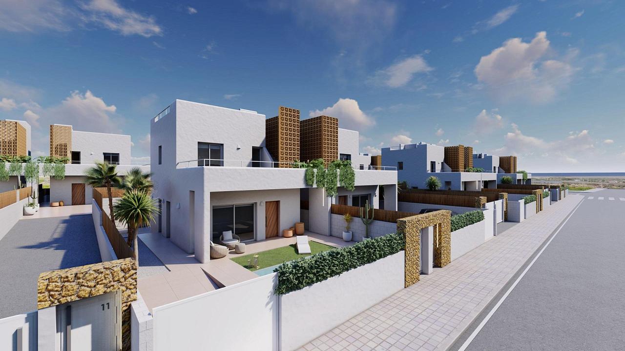 VILLAS DE OBRA NUEVA EN PILAR DE LA HORADADA villas de obra nueva en Pilar de la Horadada. El interior de las villas constan de 3 dormitorios, 3 baños en suite, amplio salón de planta abierta con cocina todo situado en dos plantas. Los exteriores disponen de un amplio jardín con piscina privada y plaza de aparcamiento. Villas de Obra Nueva donde encontrará el mejor estilo mediterráneo adaptado al diseño moderno. Residencial formado por 17 villas situadas en Pilar de la Horadada, rodeadas de todos los servicios que necesitas y a pocos minutos de la playa. Pilar de la Horadada es un típico pueblo español situado en la parte más meridional de la Costa Blanca. La gran calle principal tiene supermercados, muchas tiendas, restaurantes y bares y algunas plazas encantadoras. Las hermosas playas de Torre de la Horadada y Mil Palmeras con arena fina y paseo marítimo está a sólo 5 minutos. En Pilar de la Horadada también hay una red de carriles bici y de senderismo bien desarrollada, y también hay una gran oferta de diversas actividades deportivas. El campo de golf Lo Romero, de 18 hoyos, se encuentra a un corto trayecto en coche. Los aeropuertos de Corvera (Murcia) y Alicante se encuentran a 40 y 55 minutos respectivamente.